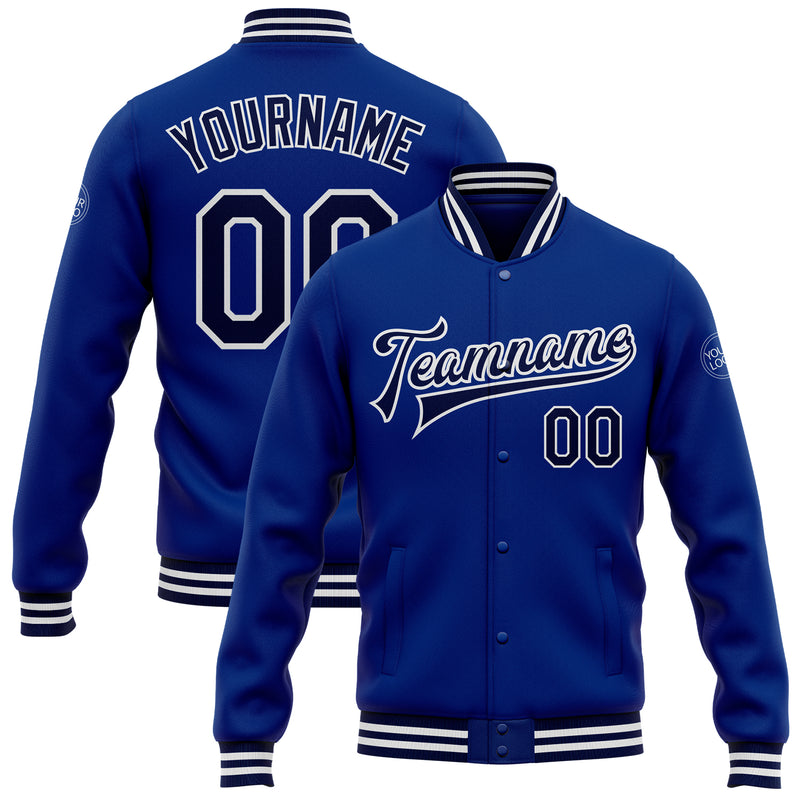 Custom Royal Navy-White Bomber Full-Snap Varsity Letterman Jacket