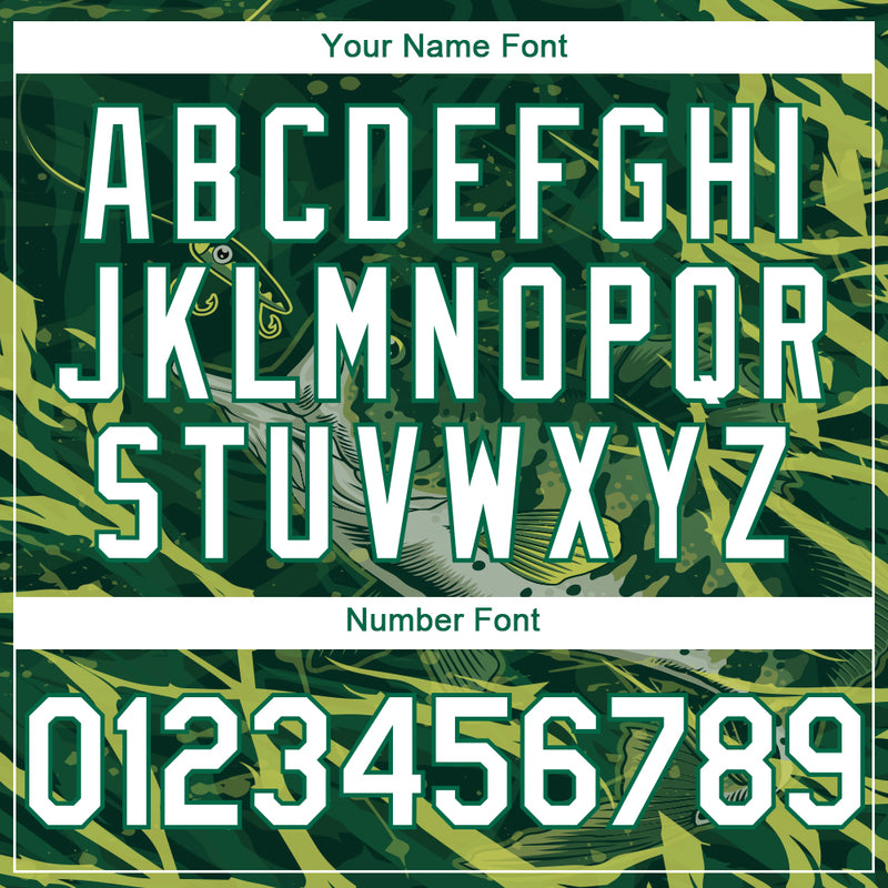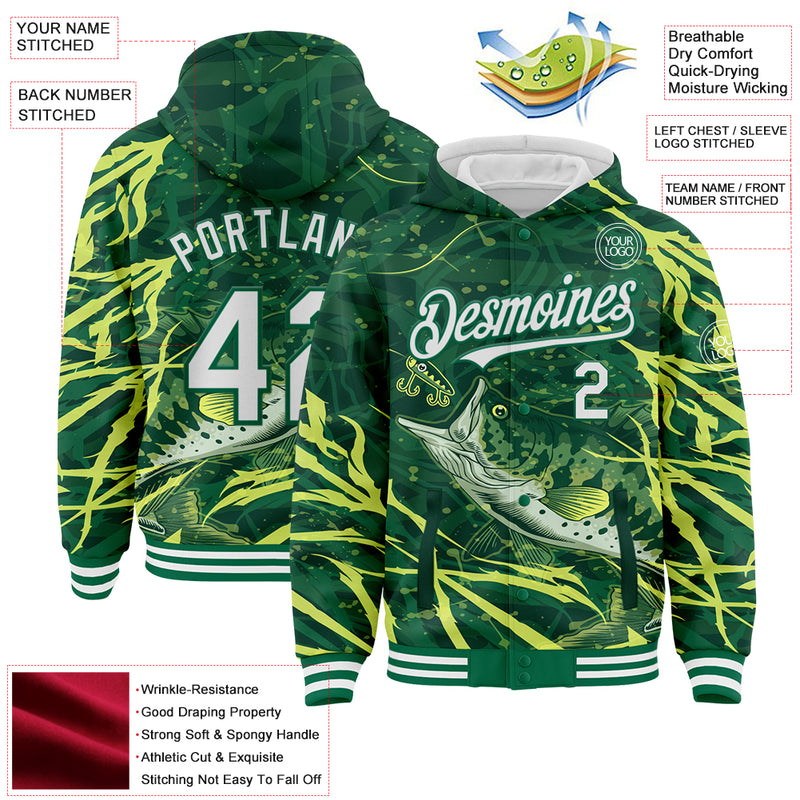 Custom Kelly Green White Largemouth Bass Fish Fishing 3D Bomber Full-Snap Varsity Letterman Hoodie Jacket