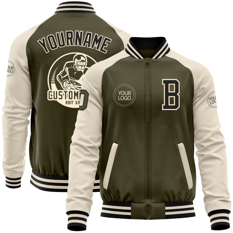 Custom Olive Black-Cream Bomber Varsity Letterman Two Tone Salute To Service Zipper Jacket