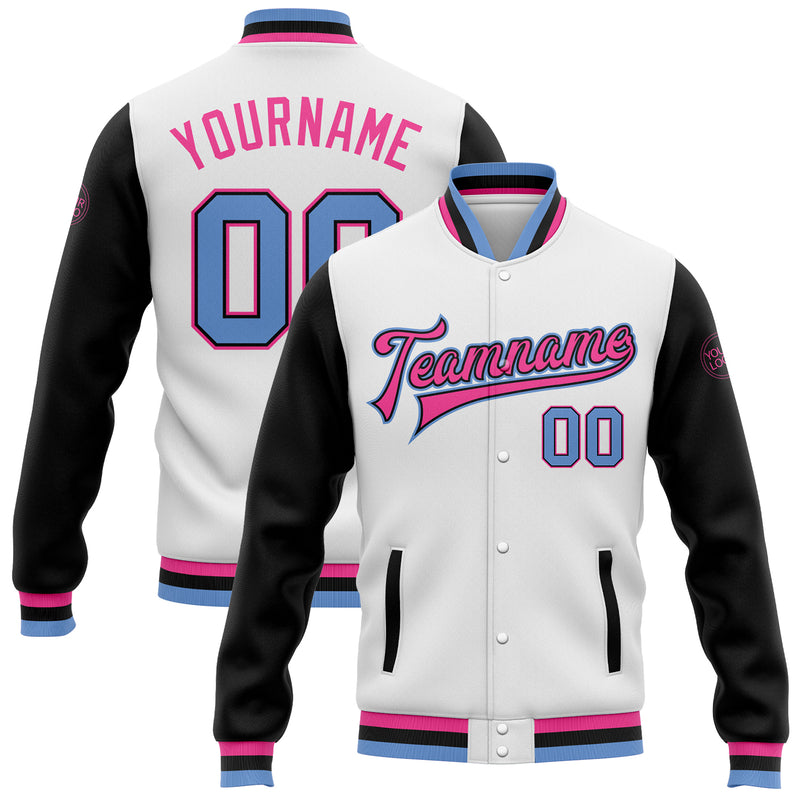 Custom White Light Blue Black-Pink Bomber Full-Snap Varsity Letterman Two Tone Jacket