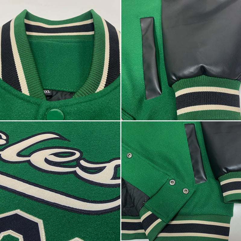 Custom Kelly Green Black-Cream Bomber Full-Snap Varsity Letterman Two Tone Jacket