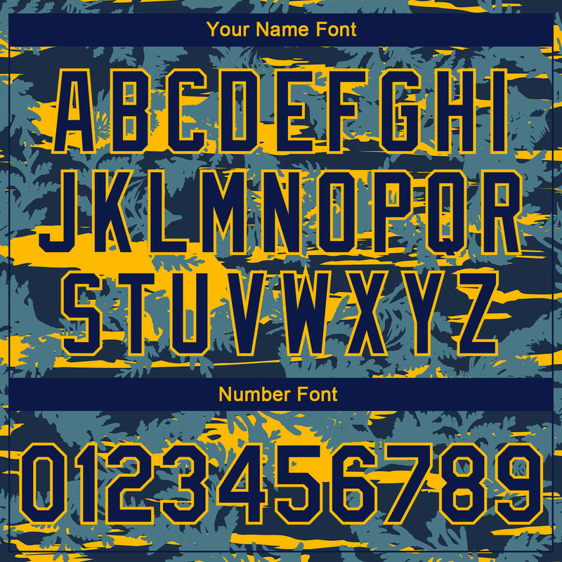 Custom Navy Gold Thuja Branch 3D Pattern Design Bomber Full-Snap Varsity Letterman Jacket