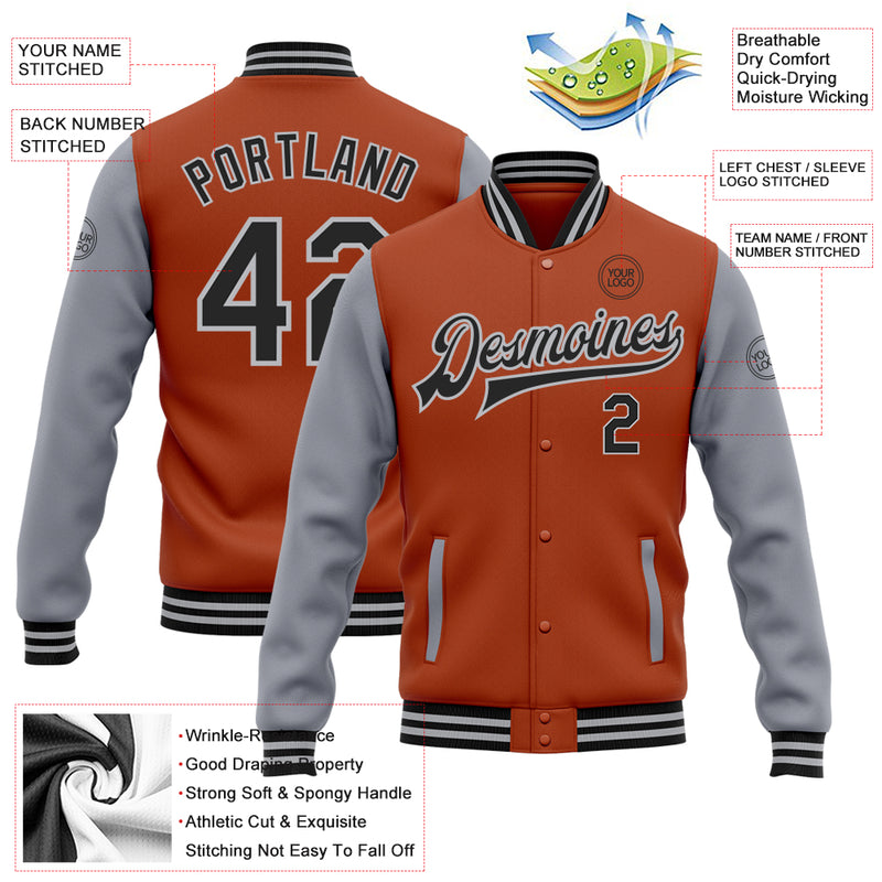 Custom Texas Orange Black-Gray Bomber Full-Snap Varsity Letterman Two Tone Jacket