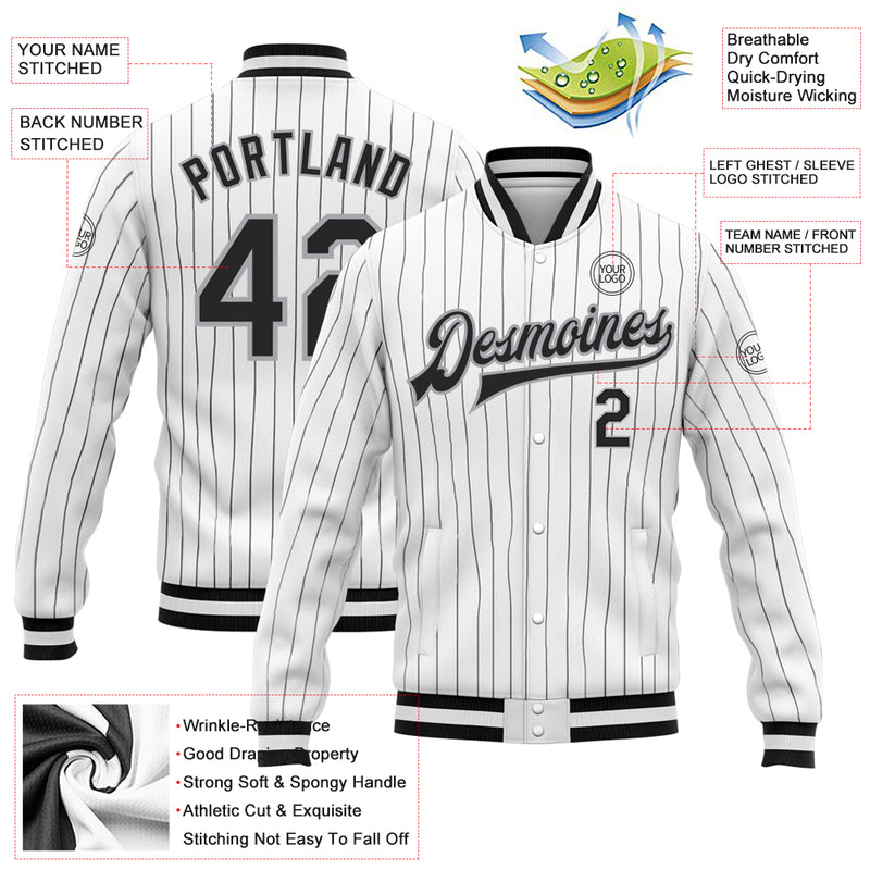 Custom White Black Pinstripe Black-Gray Bomber Full-Snap Varsity Letterman Jacket