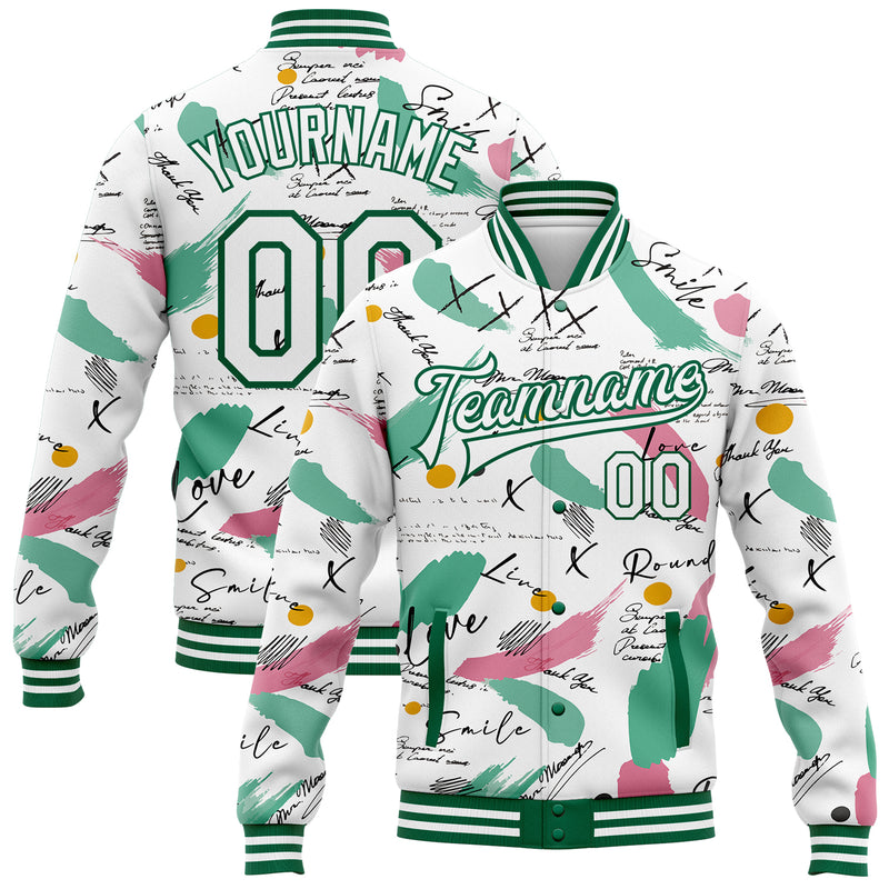 Custom Graffiti Pattern White-Kelly Green Grunge Art 3D Bomber Full-Snap Varsity Letterman Jacket