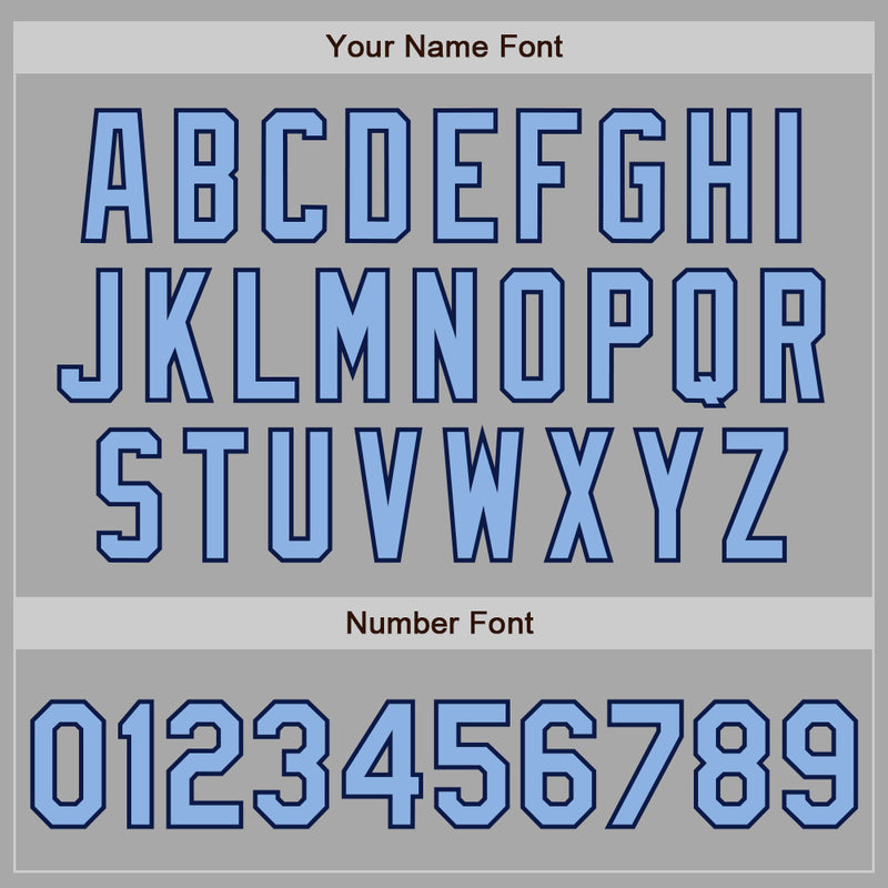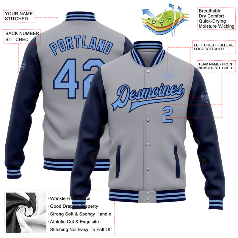 Custom Gray Light Blue-Navy Bomber Full-Snap Varsity Letterman Two Tone Jacket