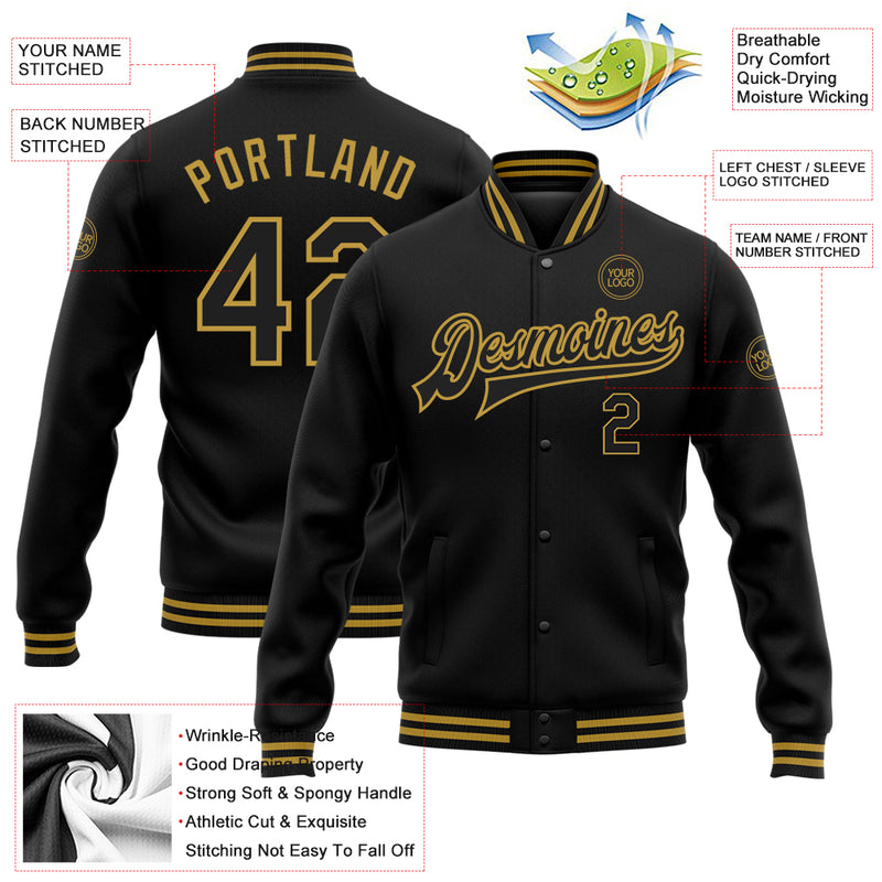 Custom Black Old Gold Bomber Full-Snap Varsity Letterman Jacket