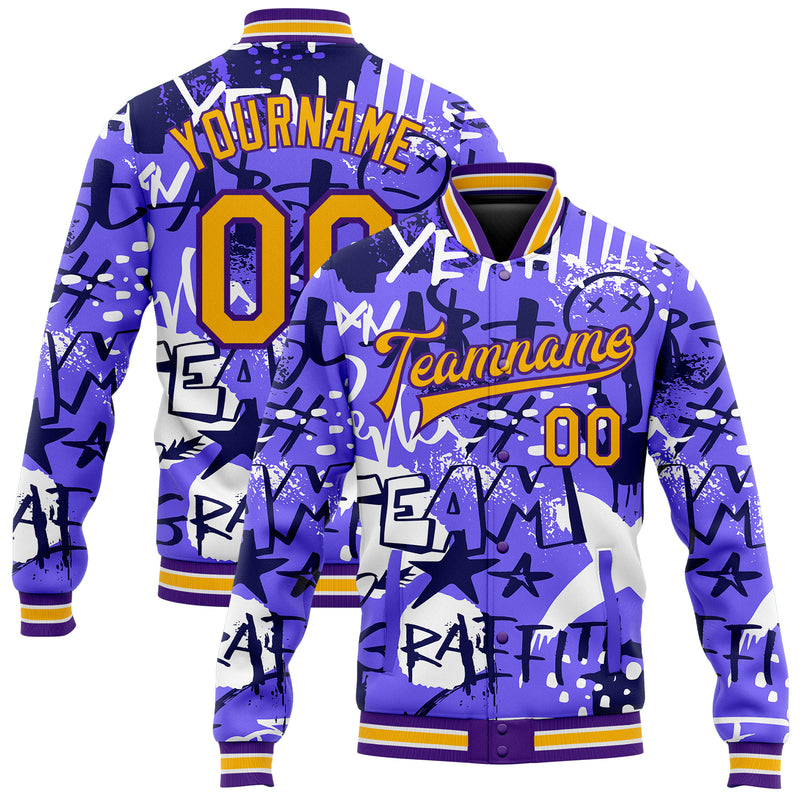 Custom Graffiti Pattern Gold-Purple Grunge Street Art 3D Bomber Full-Snap Varsity Letterman Jacket