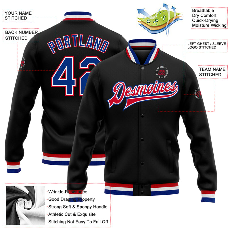 Custom Black Royal White-Red Bomber Full-Snap Varsity Letterman Jacket