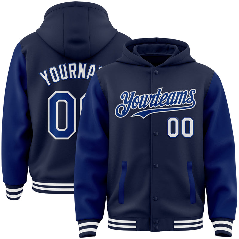 Custom Navy Royal-White Bomber Full-Snap Varsity Letterman Two Tone Hoodie Jacket