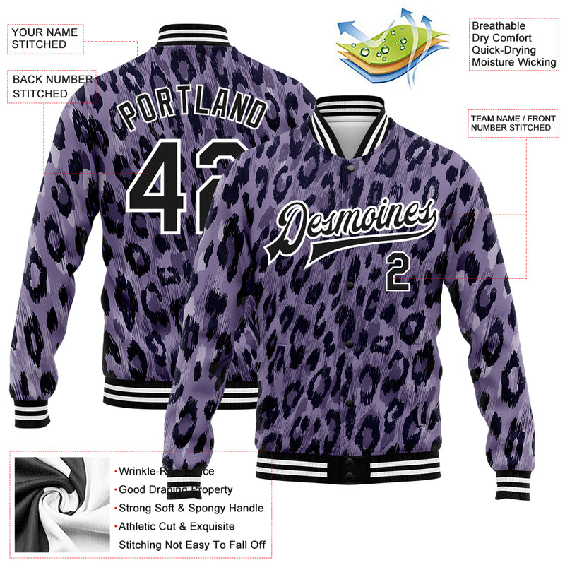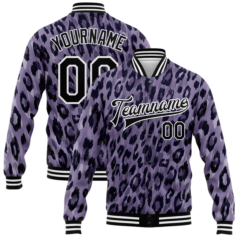 Custom Purple Black-White Leopard Print 3D Pattern Design Bomber Full-Snap Varsity Letterman Jacket