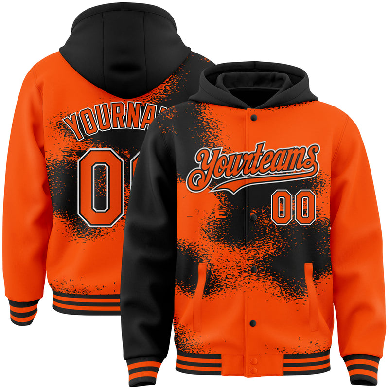 Custom Orange Black-White Abstract Color Blocks Fragment Art 3D Pattern Design Bomber Full-Snap Varsity Letterman Hoodie Jacket