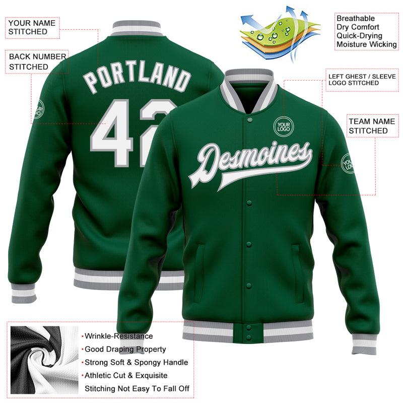 Custom Kelly Green White-Gray Bomber Full-Snap Varsity Letterman Jacket