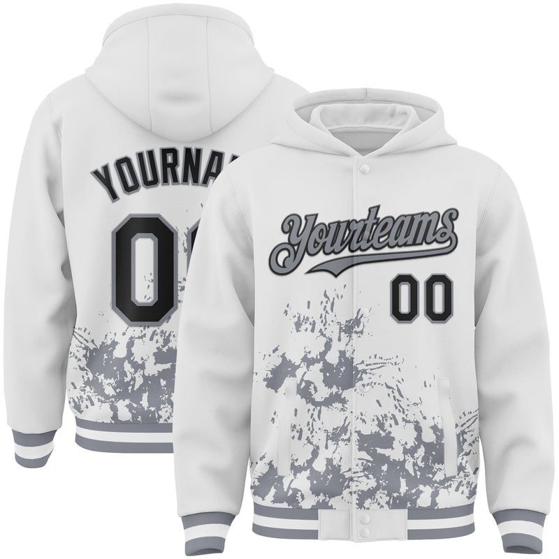 Custom White Black-Gray Splash Art 3D Pattern Design Bomber Full-Snap Varsity Letterman Hoodie Jacket