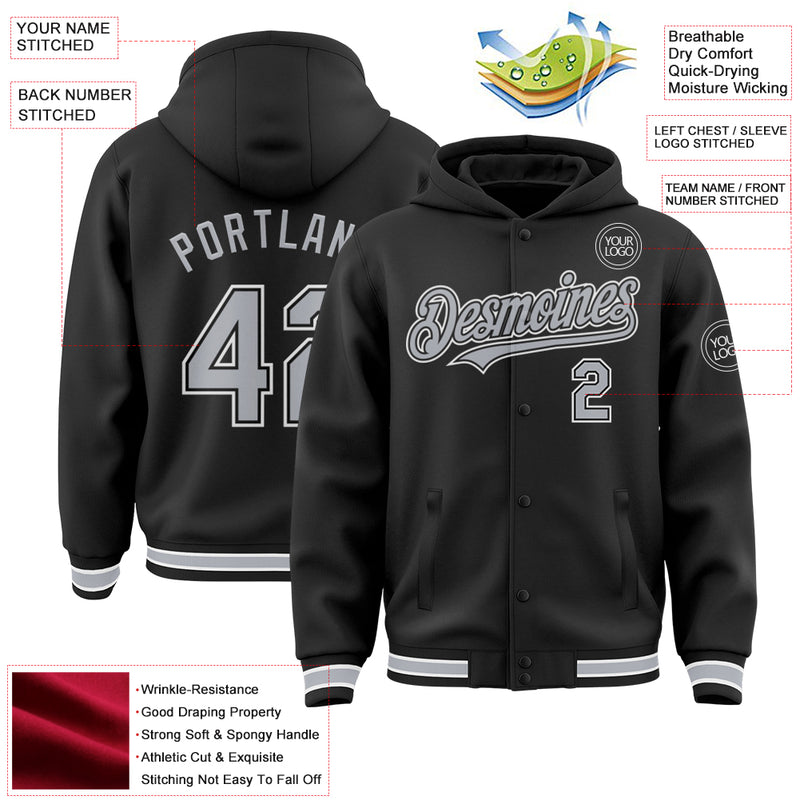 Custom Black Gray-White Bomber Full-Snap Varsity Letterman Hoodie Jacket