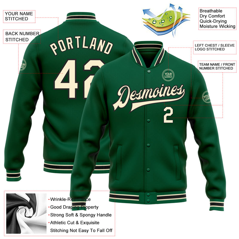 Custom Kelly Green Cream-Black Bomber Full-Snap Varsity Letterman Jacket