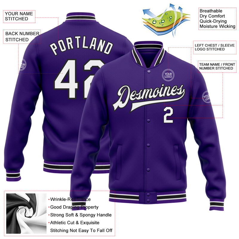 Custom Purple White-Black Bomber Full-Snap Varsity Letterman Jacket