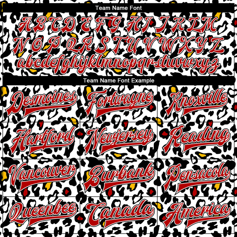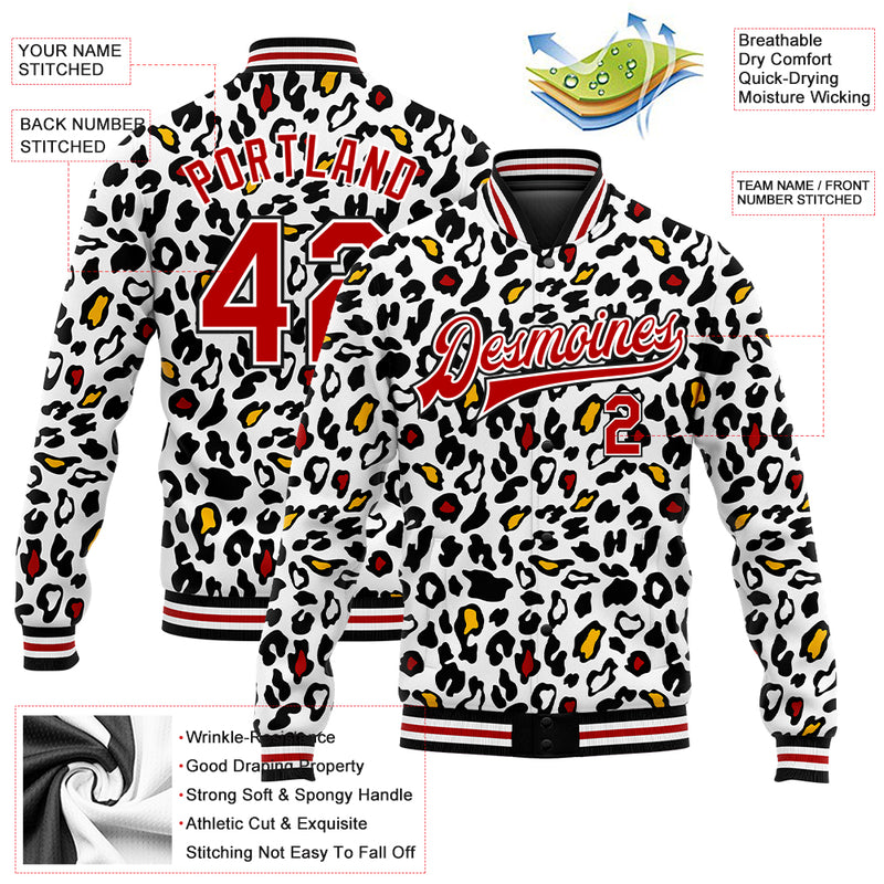 Custom White Red-Black Bright Leopard Print 3D Pattern Design Bomber Full-Snap Varsity Letterman Jacket