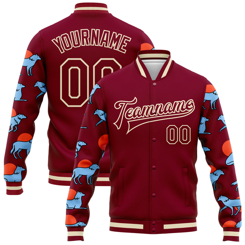 Custom Maroon Cream Wolves Hauling Jumping And Running 3D Pattern Design Bomber Full-Snap Varsity Letterman Jacket