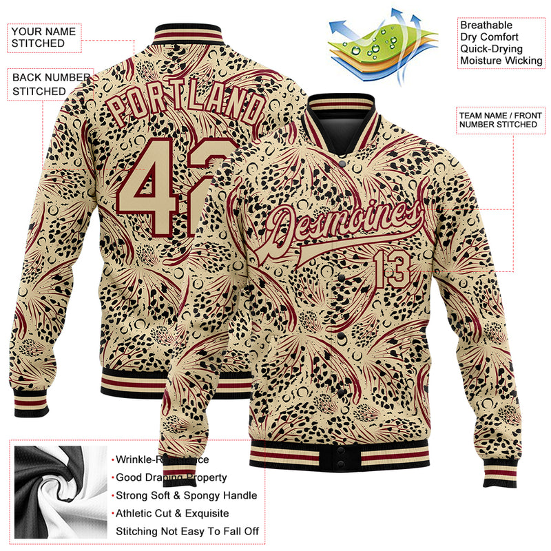 Custom City Cream Crimson-Black Animal Print 3D Pattern Design Bomber Full-Snap Varsity Letterman Jacket