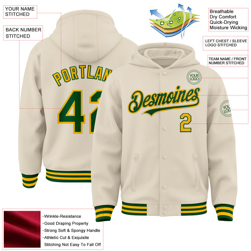 Custom Cream Green-Gold Bomber Full-Snap Varsity Letterman Hoodie Jacket