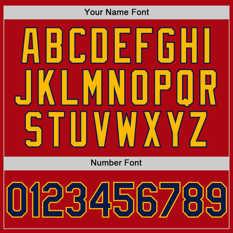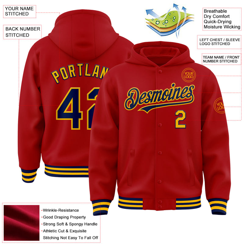Custom Red Navy-Gold Bomber Full-Snap Varsity Letterman Hoodie Jacket
