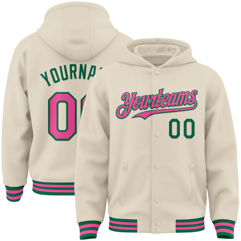 Custom Cream Pink-Kelly Green Bomber Full-Snap Varsity Letterman Hoodie Jacket