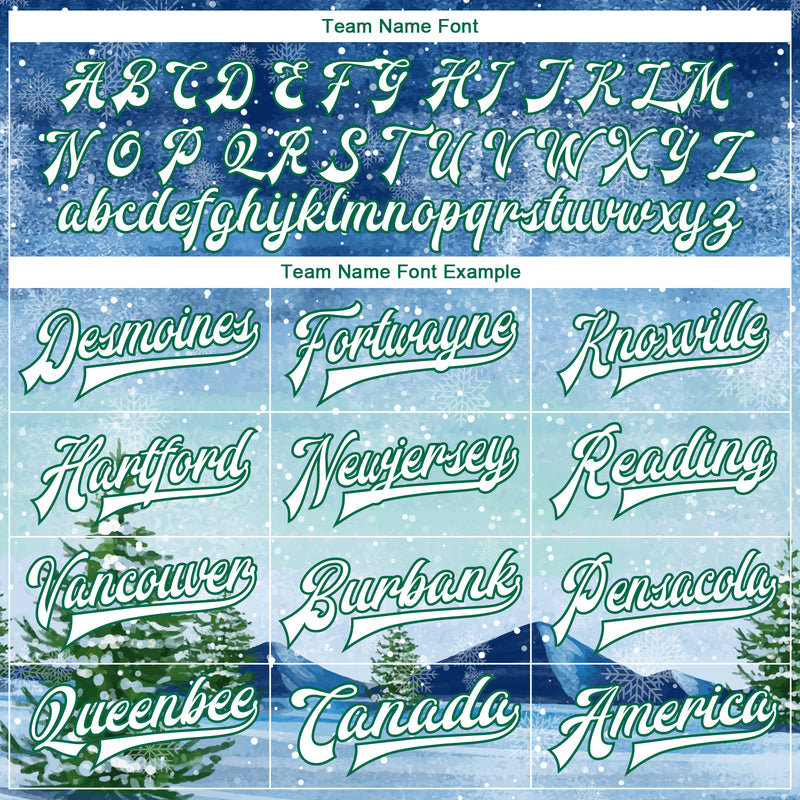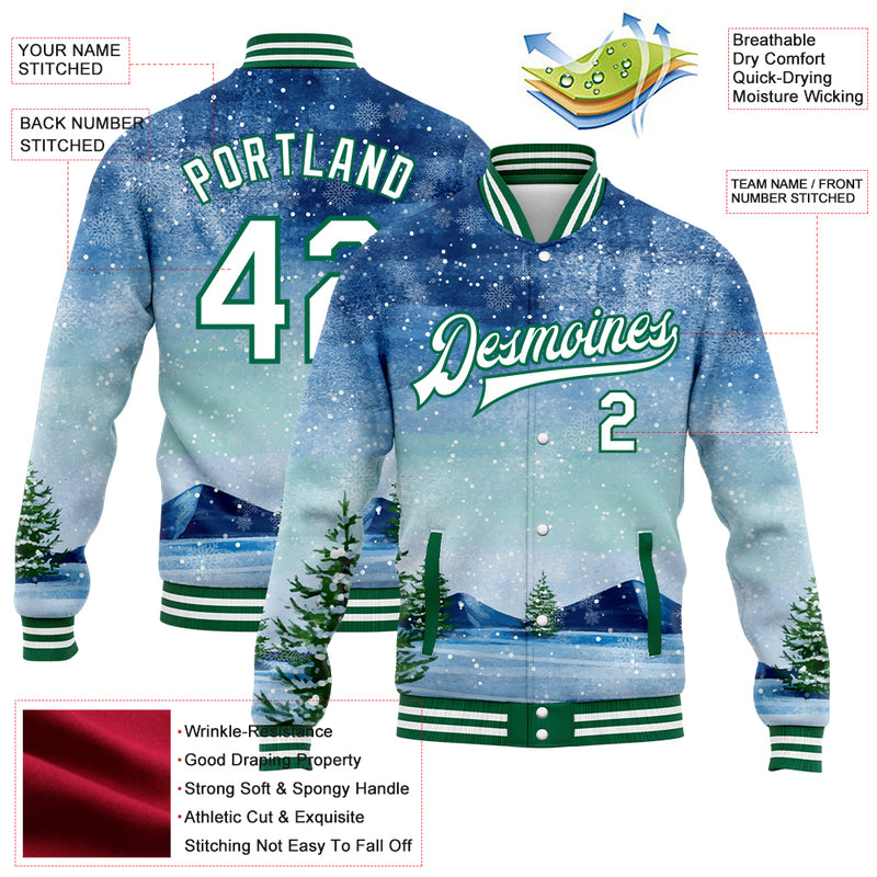 Custom Royal White-Kelly Green Watercolor Winter Landscape With Snowy Trees 3D Pattern Design Bomber Full-Snap Varsity Letterman Jacket
