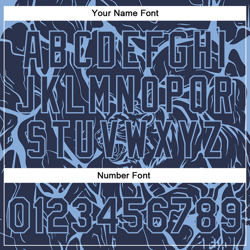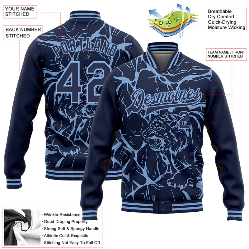 Custom Navy Light Blue Abstract Network And Tiger 3D Pattern Design Bomber Full-Snap Varsity Letterman Jacket