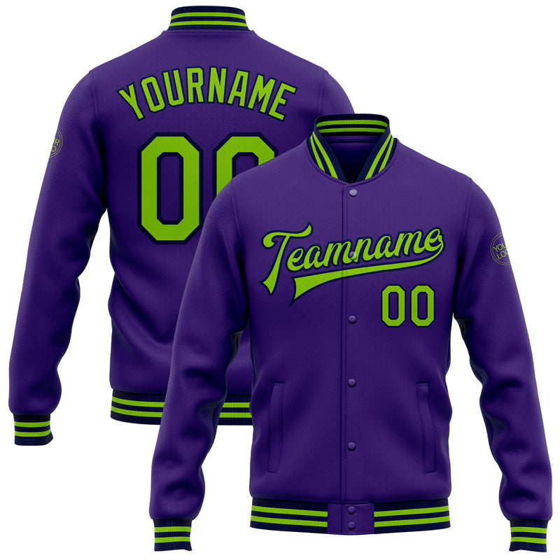 Custom Purple Neon Green-Navy Bomber Full-Snap Varsity Letterman Jacket