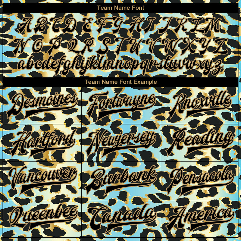 Custom Sky Blue Black-Old Gold Leopard Print 3D Pattern Design Bomber Full-Snap Varsity Letterman Jacket