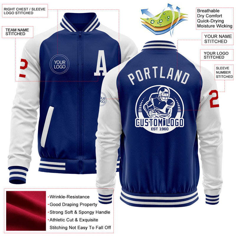 Custom Royal White Bomber Full-Snap Varsity Letterman Two Tone Jacket