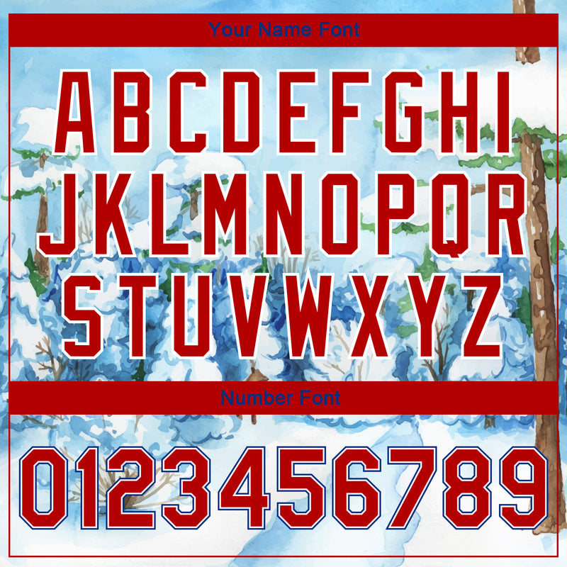 Custom Light Blue Red-Royal Watercolor Winter Landscape With Snowy Trees 3D Pattern Design Bomber Full-Snap Varsity Letterman Jacket