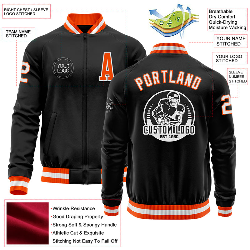 Custom Black Orange-White Bomber Varsity Letterman Zipper Jacket