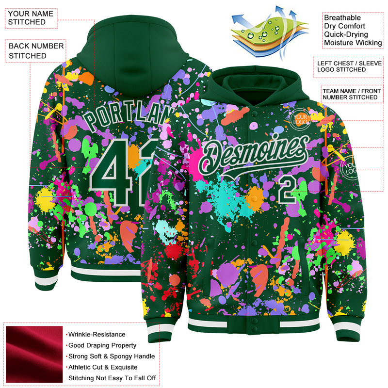 Custom Graffiti Pattern Kelly Green-White Splash Bomber Full-Snap Varsity Letterman Hoodie Jacket