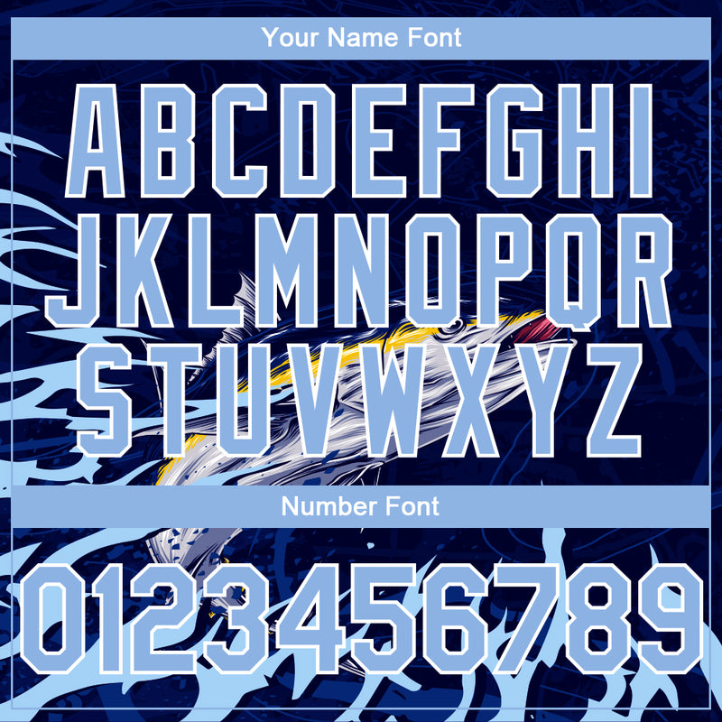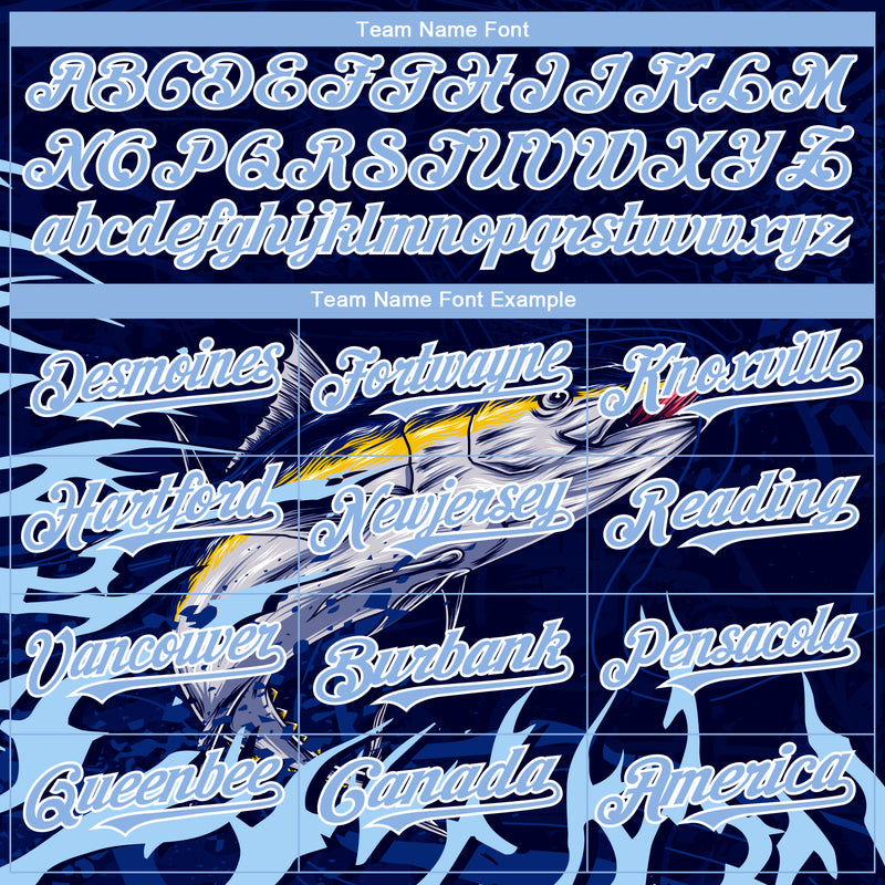Custom Navy Light Blue-White Tuna Fish Fishing 3D Bomber Full-Snap Varsity Letterman Hoodie Jacket