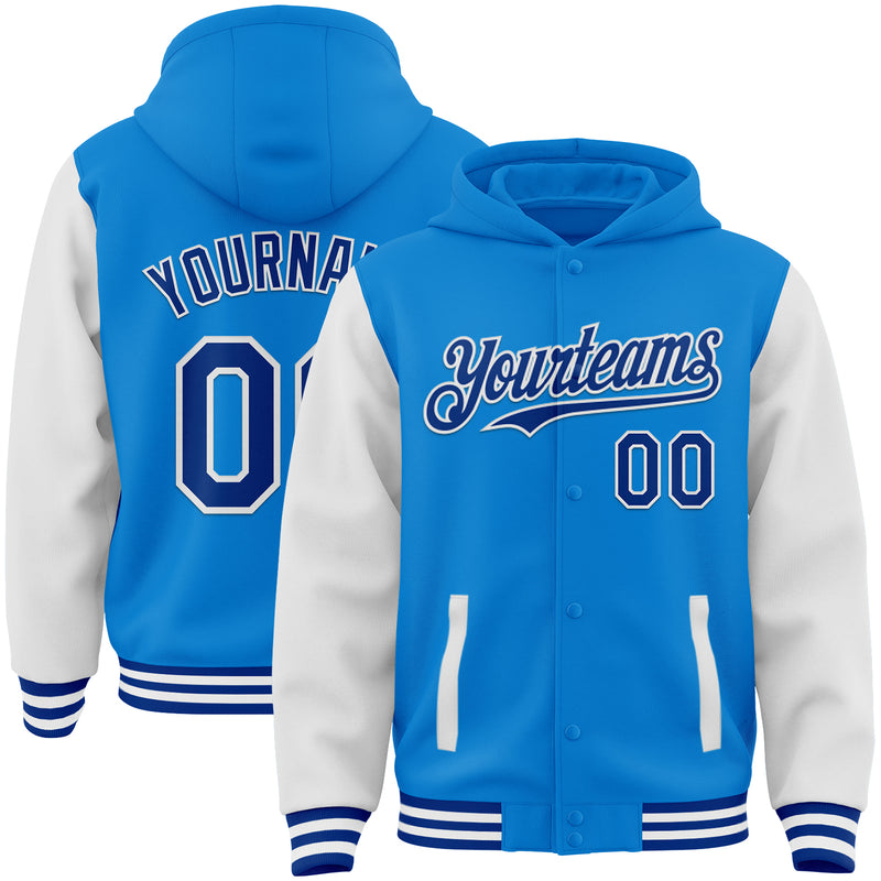 Custom Powder Blue Royal-White Bomber Full-Snap Varsity Letterman Two Tone Hoodie Jacket
