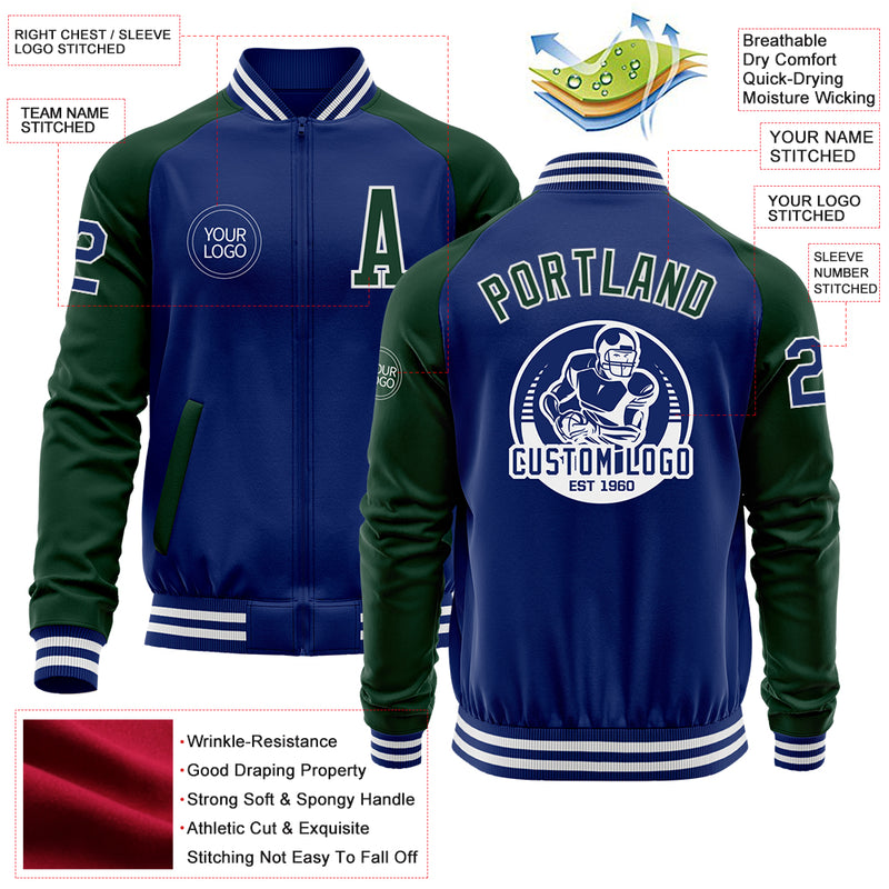 Custom Royal Green-White Bomber Varsity Letterman Two Tone Zipper Jacket