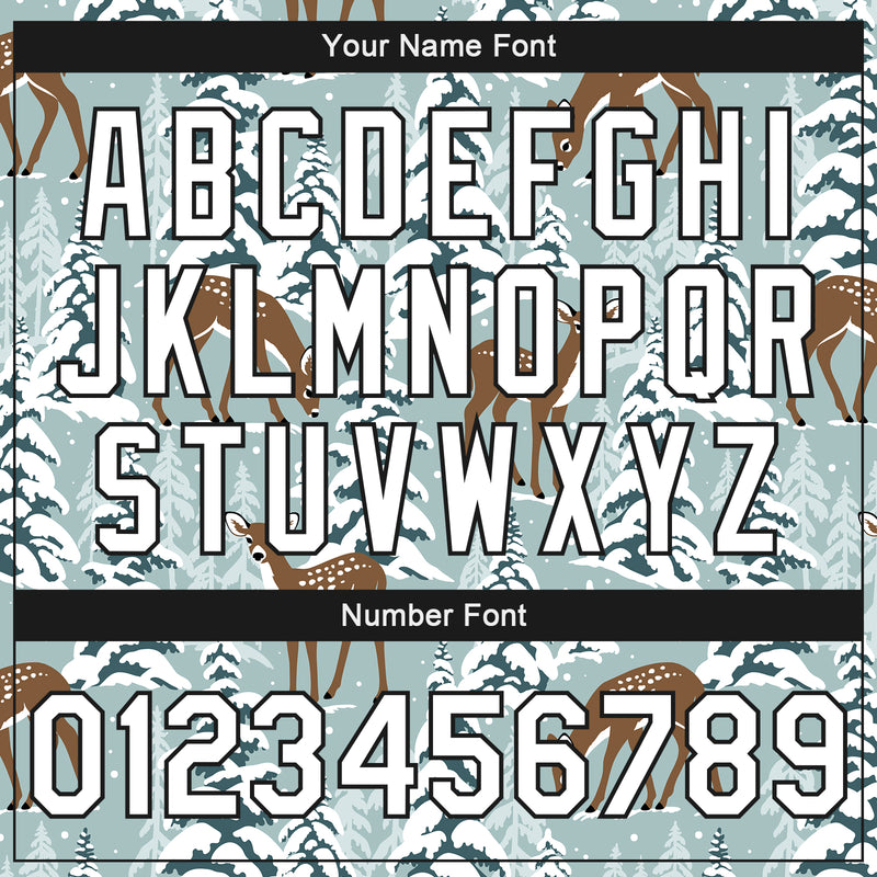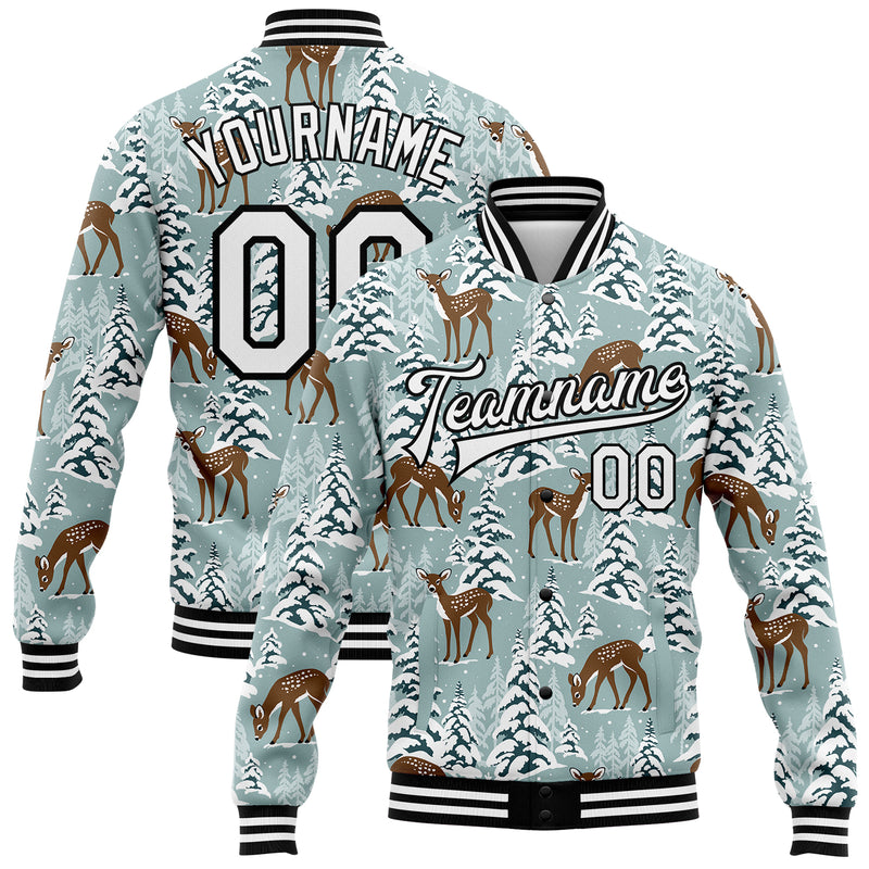 Custom Teal Black-White Winter Snowy Landscape With Deer 3D Pattern Design Bomber Full-Snap Varsity Letterman Jacket