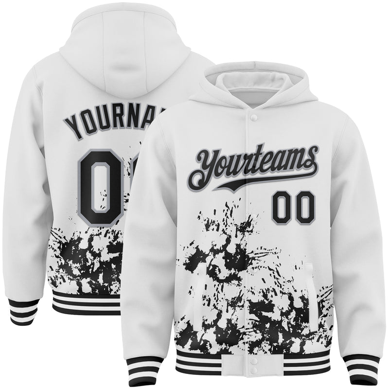 Custom White Black-Gray Splash Art 3D Pattern Design Bomber Full-Snap Varsity Letterman Hoodie Jacket
