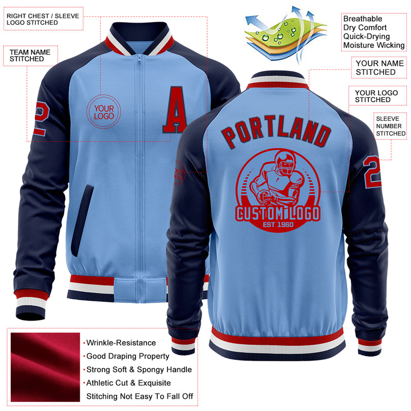 Custom Light Blue Red-Navy Bomber Varsity Letterman Two Tone Zipper Jacket
