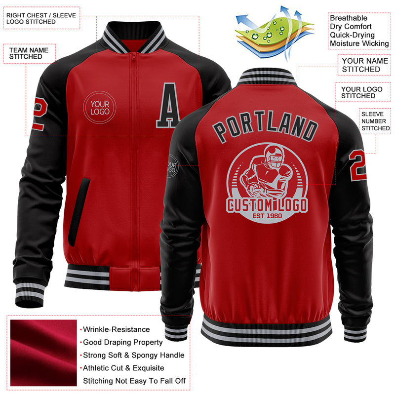 Custom Red Black-Gray Bomber Varsity Letterman Two Tone Zipper Jacket