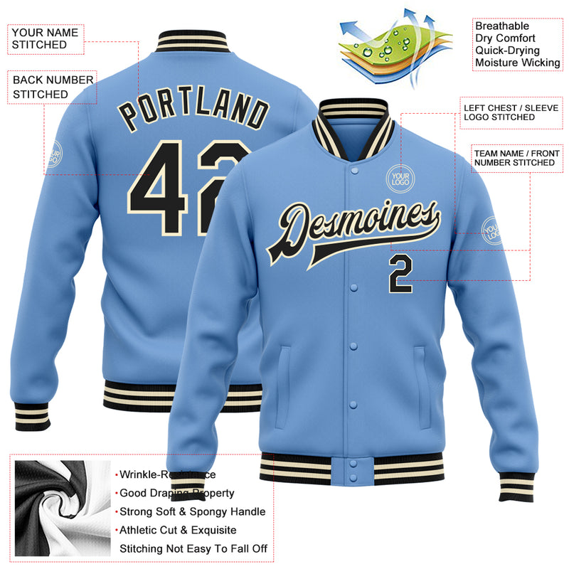 Custom Light Blue Black-Cream Bomber Full-Snap Varsity Letterman Jacket