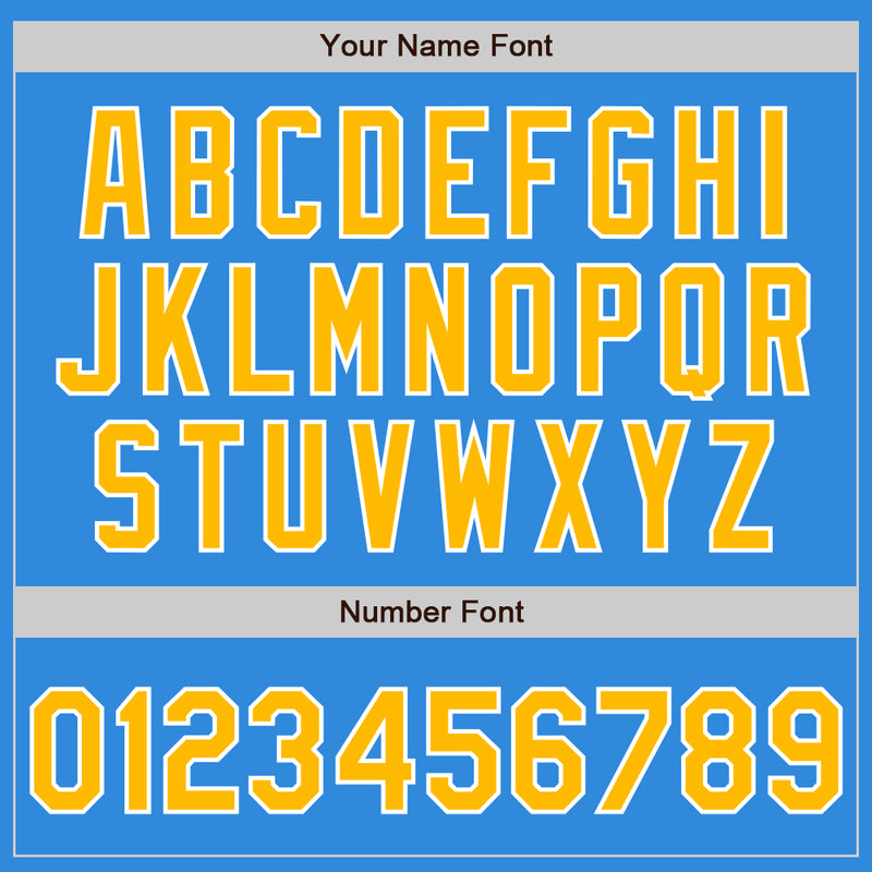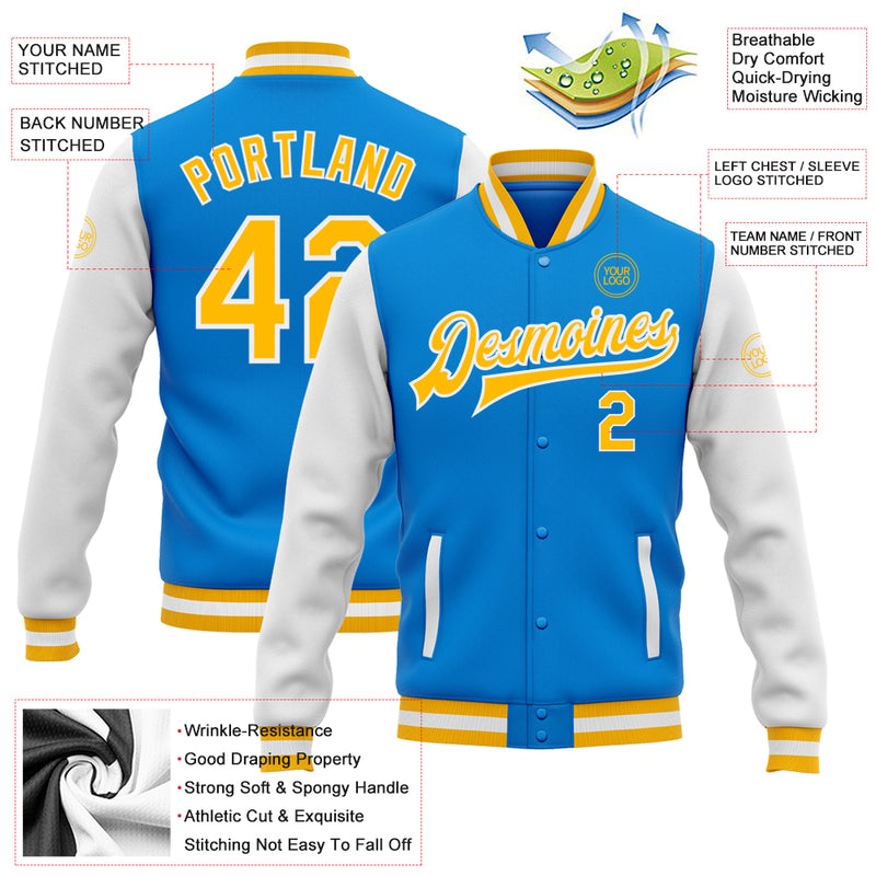 Custom Powder Blue Gold-White Bomber Full-Snap Varsity Letterman Two Tone Jacket