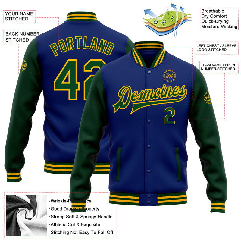 Custom Royal Green-Gold Bomber Full-Snap Varsity Letterman Two Tone Jacket
