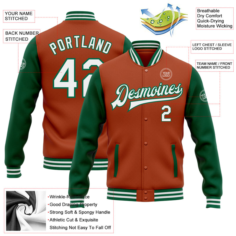 Custom Texas Orange White-Kelly Green Bomber Full-Snap Varsity Letterman Two Tone Jacket
