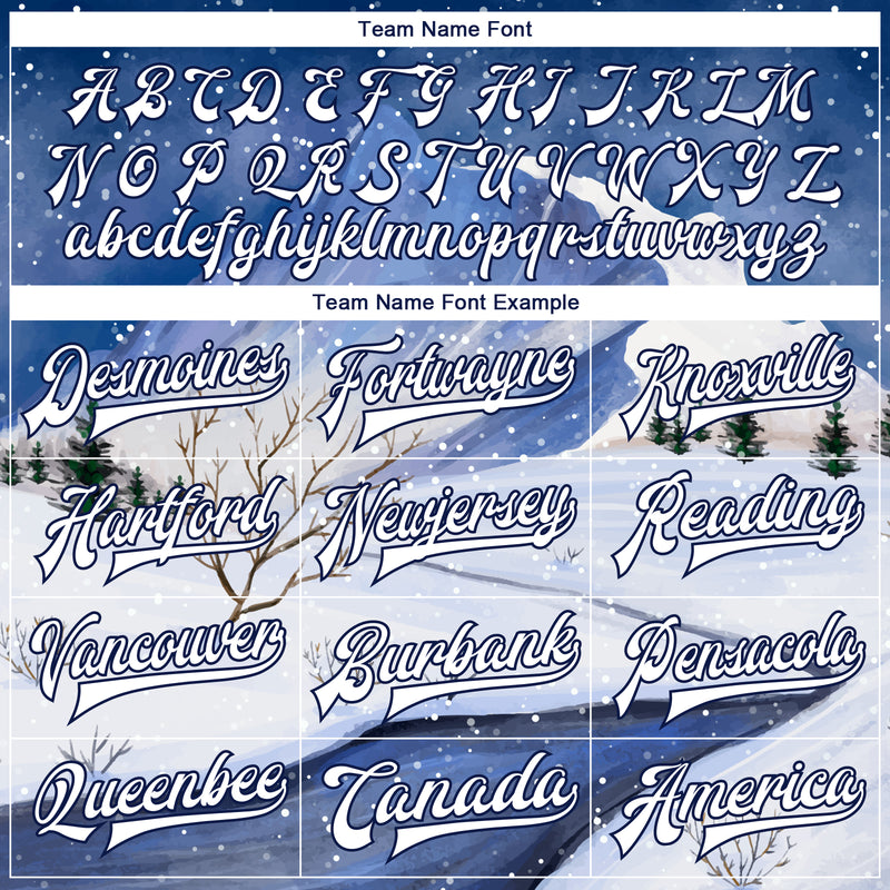 Custom Royal White-Navy Watercolor Winter Snow Landscape 3D Pattern Design Bomber Full-Snap Varsity Letterman Jacket