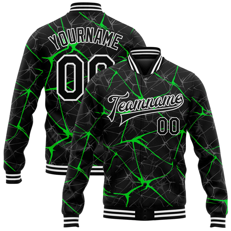 Custom Black Neon Green 3D Pattern Design Bomber Full-Snap Varsity Letterman Jacket