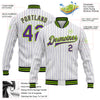 Custom White Purple Pinstripe Neon Green-Black Bomber Full-Snap Varsity Letterman Jacket