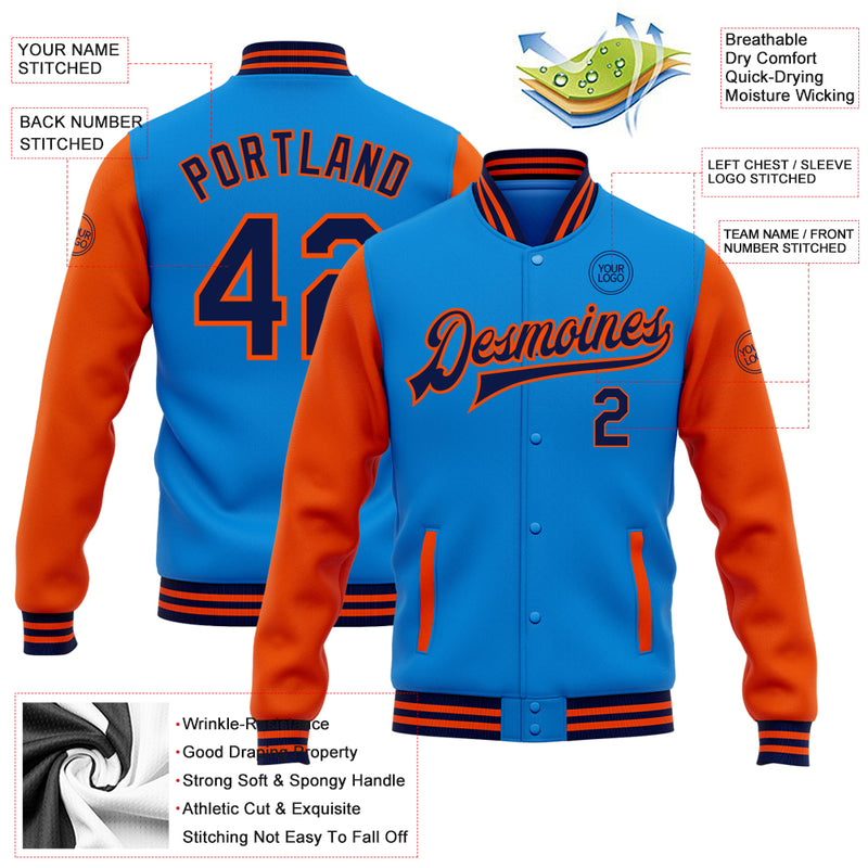 Custom Powder Blue Navy-Orange Bomber Full-Snap Varsity Letterman Two Tone Jacket